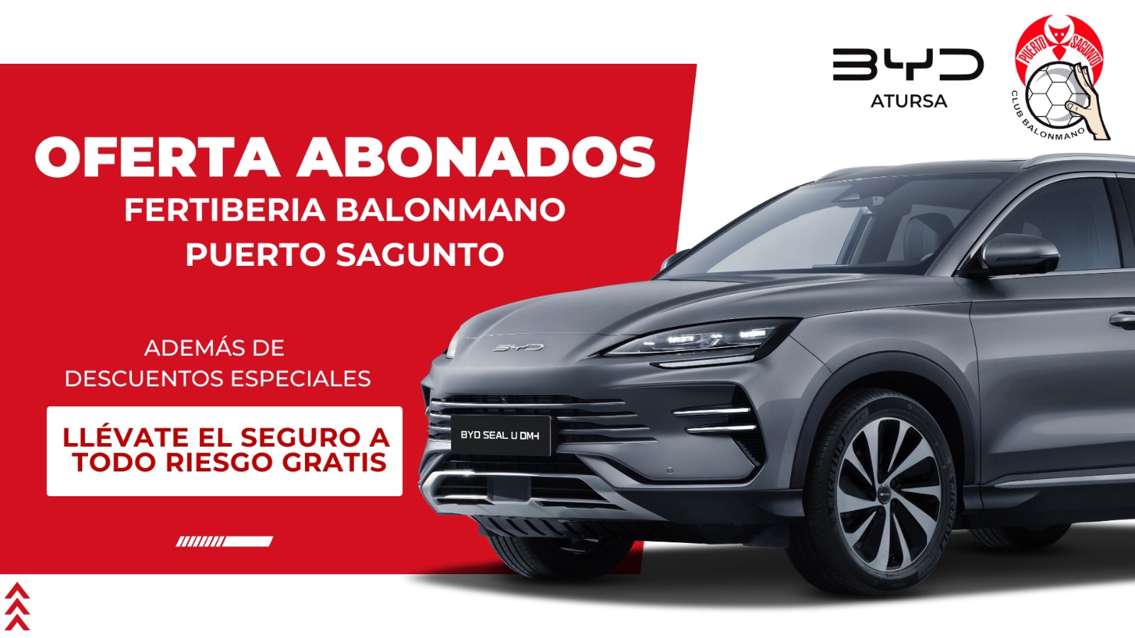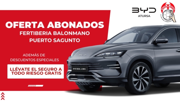 En BYD Atursa Automoción estamos orgullosos de apoyar al Fertiberia Balonmano Puerto Sagunto y de reforzar nuestro compromiso con el deporte local y su afición. Por eso, hemos preparado una oferta exclusiva: todos los abonados del club y sus familiares que presenten el carnet de socio podrán disfrutar de condiciones especiales en la compra de su nuevo coche BYD, además de llevarse el seguro a todo riesgo de regalo.